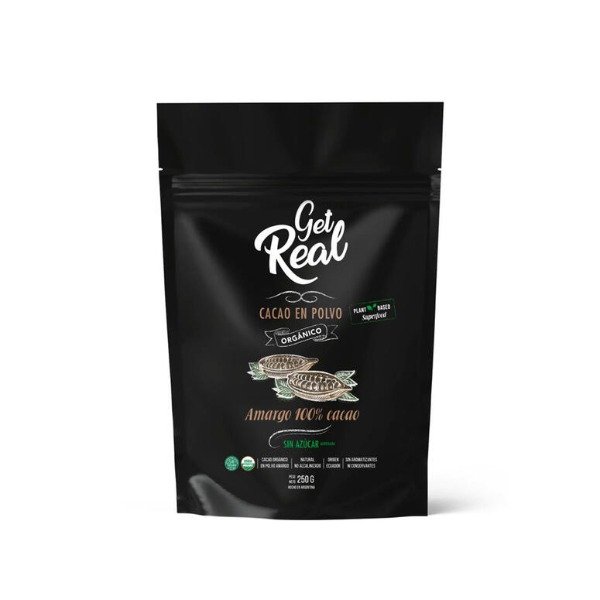 Cacao organico amargo en polvo de 250g, ideal para preparar bebidas y postres saludables.