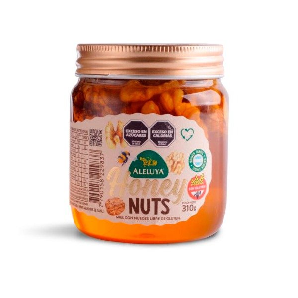 Miel con nueces x 310g, combinacion perfecta de dulzura y crocancia, ideal para disfrutar sola o acompanar postres.- SIN GLUTEN