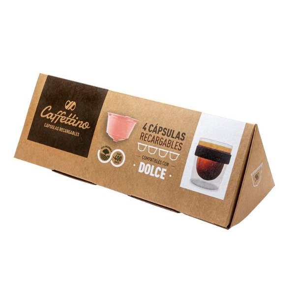 Capsulas recargables Dolce (4u) de Caffettino, ideales para disfrutar de tu cafe favorito con comodidad y sostenibilidad.