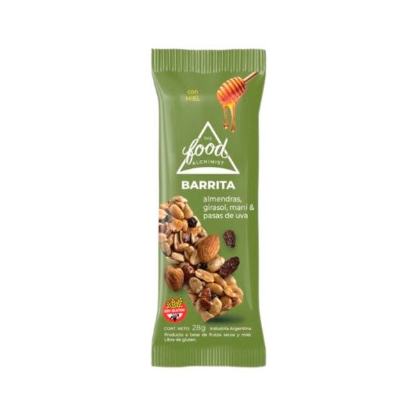Barrita de almendras, girasol, mani y pasas de uva The Food Alchimist 28g. Combinacion de frutos secos y dulzor natural. Fuente de fibra y energia para el dia a dia.- SIN GLUTEN