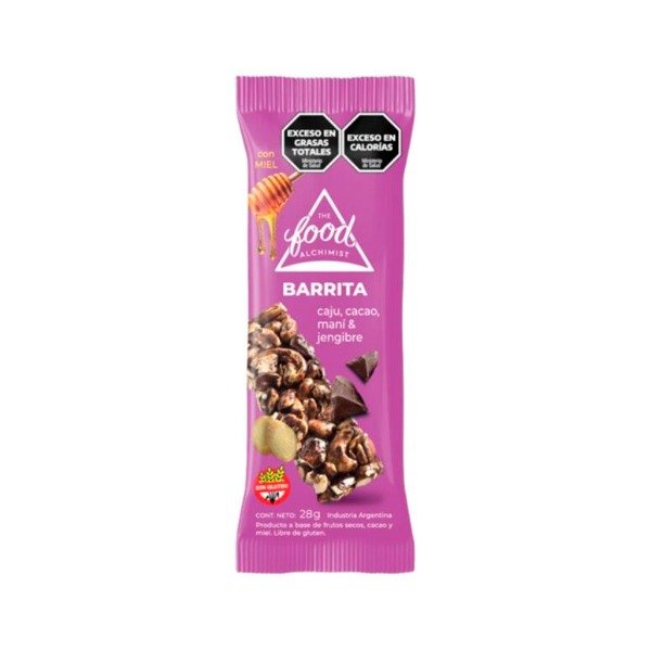 Barrita de caju, cacao, mani y jengibre The Food Alchimist 28g. Sabor intenso con notas picantes y textura firme. Snack nutritivo y original.- SIN GLUTEN