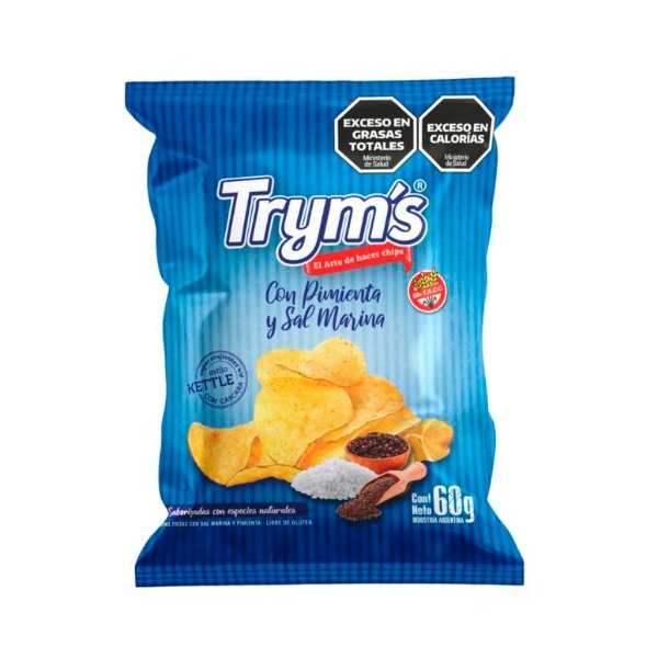 Papas con sal marina y pimienta x 60g - Tryms, combinacion clasica con un toque de picante suave.- SIN GLUTEN