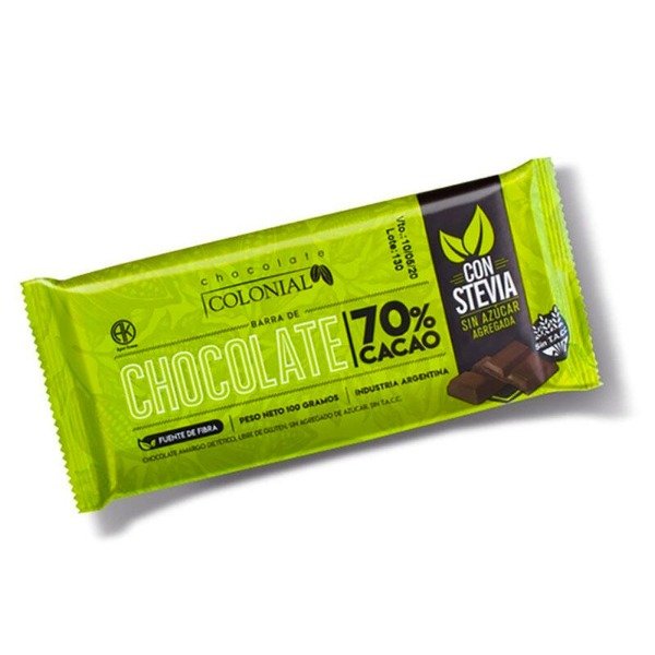 Barra de Chocolate con Stevia 70% Cacao x 100g - Chocolate Colonial - Barra de chocolate con un 70% de cacao endulzado con stevia, perfecta para disfrutar de un dulce saludable.- SIN GLUTEN