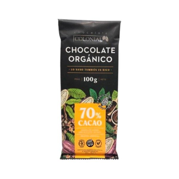 Barra de Chocolate Organico Negro 70% Cacao x 100g - Chocolate Colonial - Delicioso chocolate negro organico con 70% de cacao, perfecto para un snack saludable y delicioso.- SIN GLUTEN