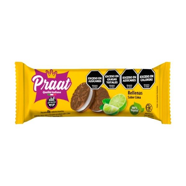 Galletitas dulces de chocolate sabor a lima Praat 85g. Combinacion citrica y chocolatada en un snack crocante. Originales y deliciosas para cualquier momento.- SIN GLUTEN
